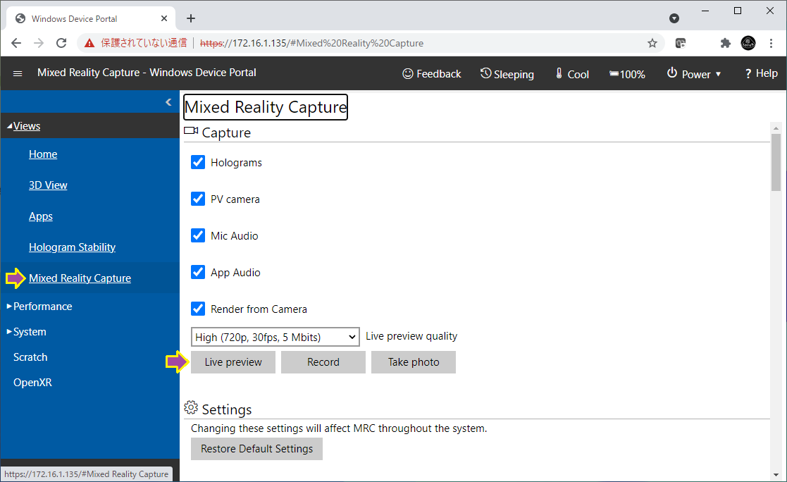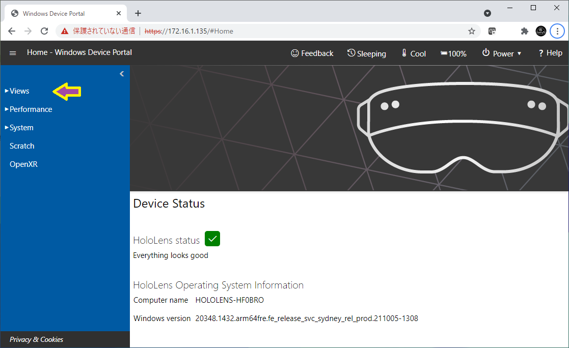 HoloLensと同じLANにつながっている機器のブラウザから、HoloLensのIPアドレス(IP4)を入力しデバイスポータルを開く。