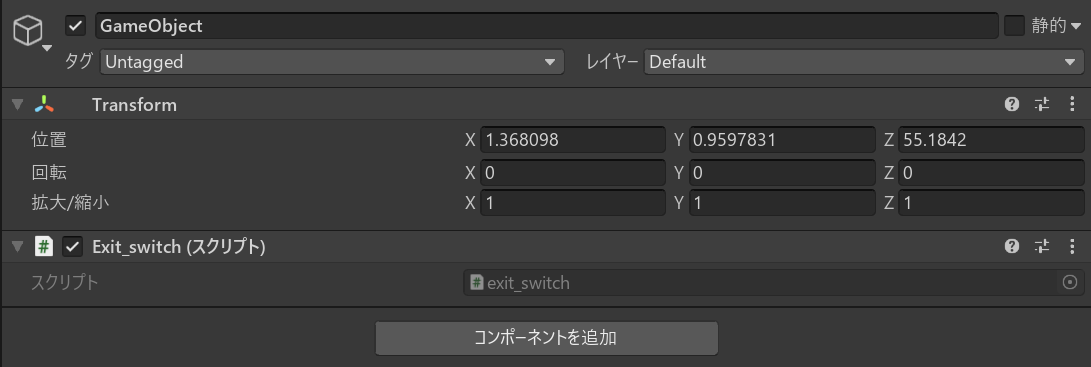 作成したオブジェクトのコンポーネントとしてスクリプトを追加。