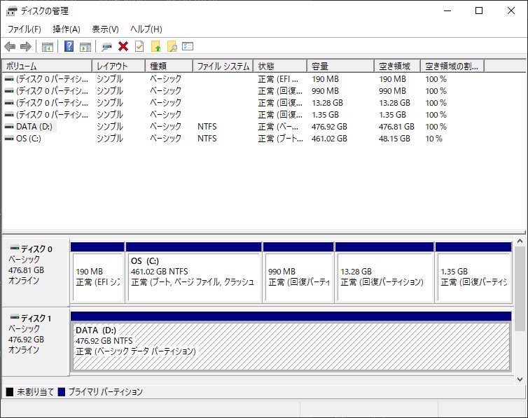SSDは認識されており、使用中のDisk0の後に、ボリューム未設定のDisk1がリストに表示される。