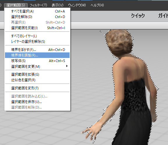 選択エリアをマスクしたレイヤーをAltキー押しながら選択すると白黒マスクが編集可能になる。