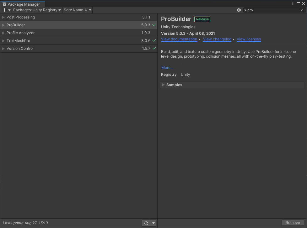 Pro Builderは、Package ManagerのUnity Registryリストから選んでインポートできる。
