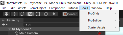 Pro Builder、ProGridsがインポートされると、Toolsメニューの中に表示される。