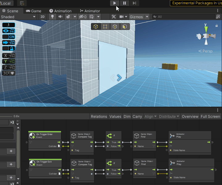 ドアという名前の付いたオブジェクトを調べ、ドア開アニメーションを再生するフローが完成。