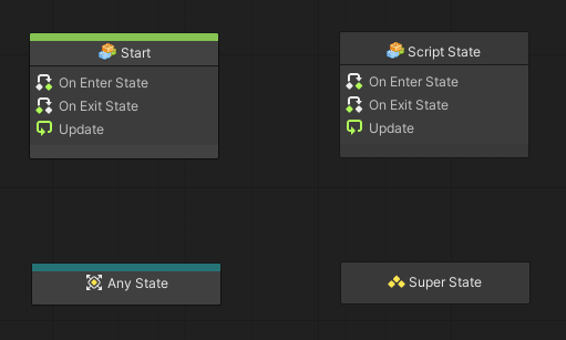 最初からStartとUpdateの2つのイベントが用意されており、C#スクリプトを新規作成した時のvoid Start () やvoid Update() に相当する。