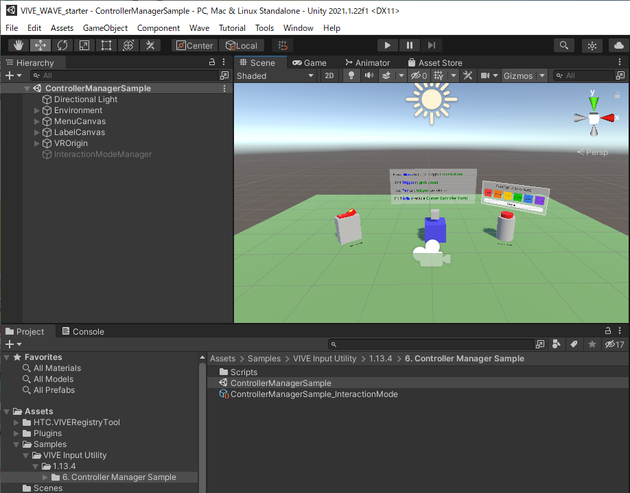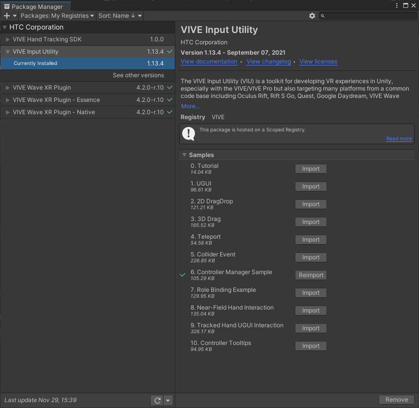 Package ManagerでVIVE Input UtilityのSampleから6.Controller Manager Sampleを選びインポートする。