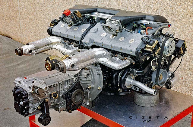 V16Tは、ダンテジアコーサ式に横置きされるUraccoのV8エンジンを左右に直列に2台積むという着想で、中央から直角にアウトプットシャフトが出ています。