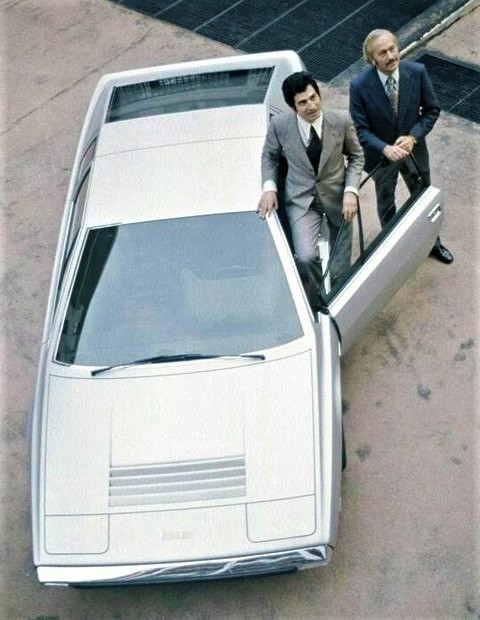 '72年発表の プロトタイプ (アルミボディ)から、プロダクションモデルでFRPに製法が変わる際、Maserati Boomerang(写真後ろ)のエッジを強調した形状に変化しています。FRP