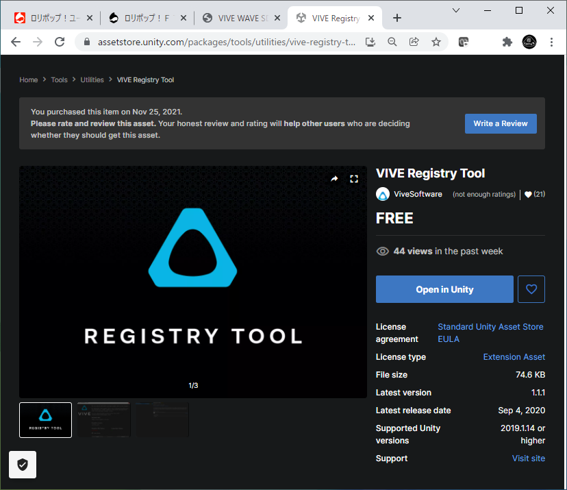 UnityAssetsStoreで"VIVE REGISTRY"を検索し、プロジェクトにインポートする。