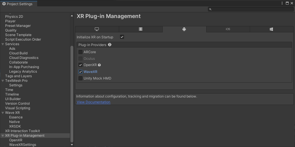 Project Setting>XR Plug-in Managementの設定で、WaveXRを選ぶ。